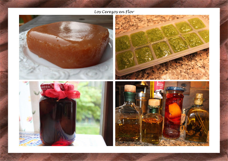 Aquí mi membrillo que tan orgullosa me siento, el pesto hecho con la albahaca de mi huertecito, higos en almíbar y mis aceites ( de albahaca), de guindillas, y de ajo seco, perejil y guindilla, y aceite de trufas que es comprado, las cosas como son,y vinagre casero ( lleva vinagre balsámico blanco con ciruela, piel de naranja, limón, tomillo,ajo)
